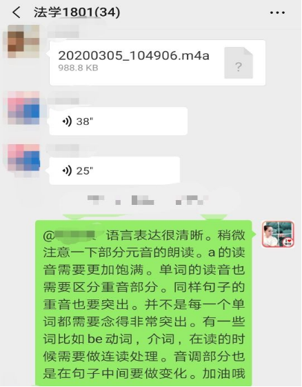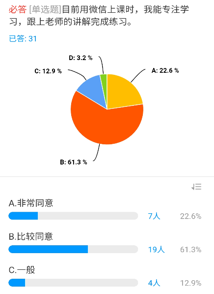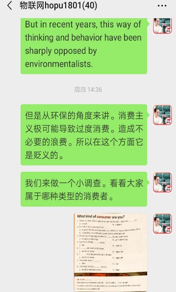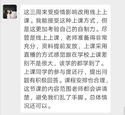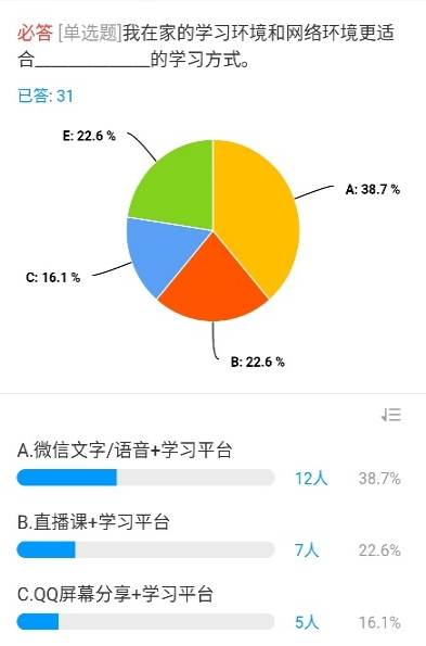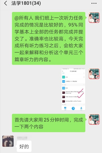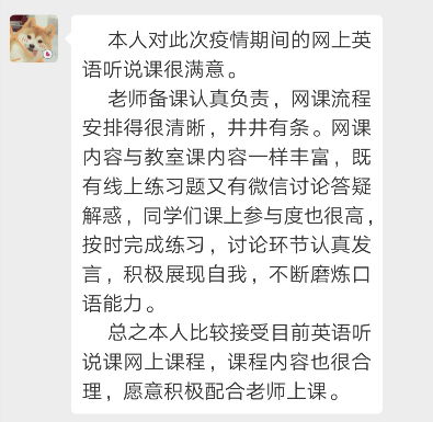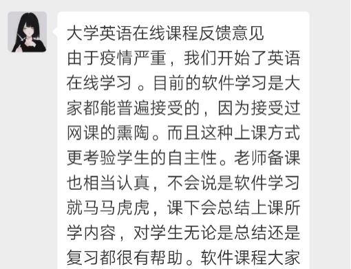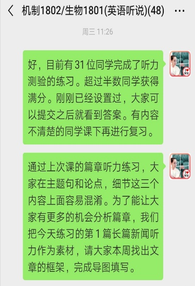 因疫情影响本学期大学英语课程采用线上教学模式。对于注重沟通和语言表达的大学英语视听说课程来说是一次很大的挑战。由于学习通教学平台压力大经常出现网络拥堵并关闭某些功能以及家中WIFI信号也不稳定的情况下,肖琳老师尝试了微信+学习通平台相结合的网络教学模式,除了需要更多的精力投入到教学内容,她还尝了多种课堂互动、课后练习等环节的设计,情况如下: 1.小组活动采取平台提交任务,自评分+组内评分+教师评分相结合的方式完成。在微信中进行小组口语分享。已完成该小组任务的7个课堂班级中,学生都认真完成并积极参与分享。同时她也发现线上课程能更近距离的了解学生需求,发现他们的问题,并能让教师更有针对性的给出解决方法。 2.每一次的课堂都按照教学计划在学习通APP中进行章节任务和活动设计,包括控制好课中练习、讨论、调查问卷及抢答活动每一个环节的时间。在清晰明确的教学指令下,学生都能积极参与和学习。 3.由于讲解内容较多,每一次课程结束肖琳老师都会做一次课程总结,发给学生作为课下复习的参考。学生能很清楚地通过总结了解练习中的问题以及课下需要完成的任务。目前大部分的学生非常支持这种学习方式。 4.积极发挥在线平台的数据统计功能,及时发现学生练习听力中的问题,让学生在课堂中进行讨论,最后再进行指导和说明。 当学生提交完任务后,能发现错误率较高的题目。有些班的简答题和填空题错误率很高,属于语言概括方面的问题。有些班则在单选题上错误率较高,属于篇章细节理解方面的问题。根据每个班不同的情况,教师可以专项进行讲解,更有针对性地解决学生的问题。 5.经过三周的在线课程教学,面对可能出现的网络拥堵和学习环境问题,肖琳老师在设计教学活动和内容时都会准备多种方案,以随时应对突发状况。8个班的学生总体上都能在课堂时间积极参与活动,完成课堂练习以及课后听力或口语任务。在学生的反馈中,也能发现大多数同学表达了对在线课程的肯定态度和积极学习的主动意愿。(以下截图来自会计班的课后访谈) 考虑到学生更希望老师进行更直观的讲解,后期会使用腾讯会议用实时屏幕分享的方式对课程练习中的重难点进行语音讲解,并考虑加入更多的课堂活动。